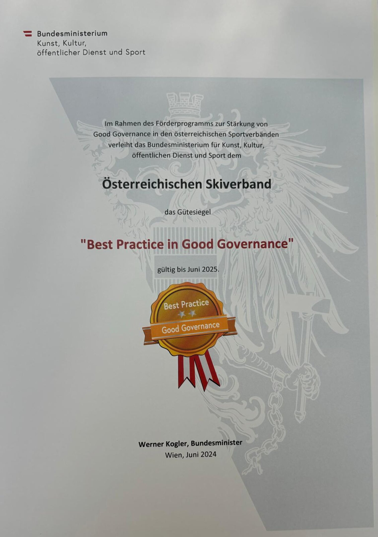 Im Rahmen eines vom BMKÖS initiierten Förderprogramms zur Stärkung von Good Governance in den österreichischen Sportverbänden, wurde dem ÖSV ein "Best Practice"-Zertifikat verliehen.