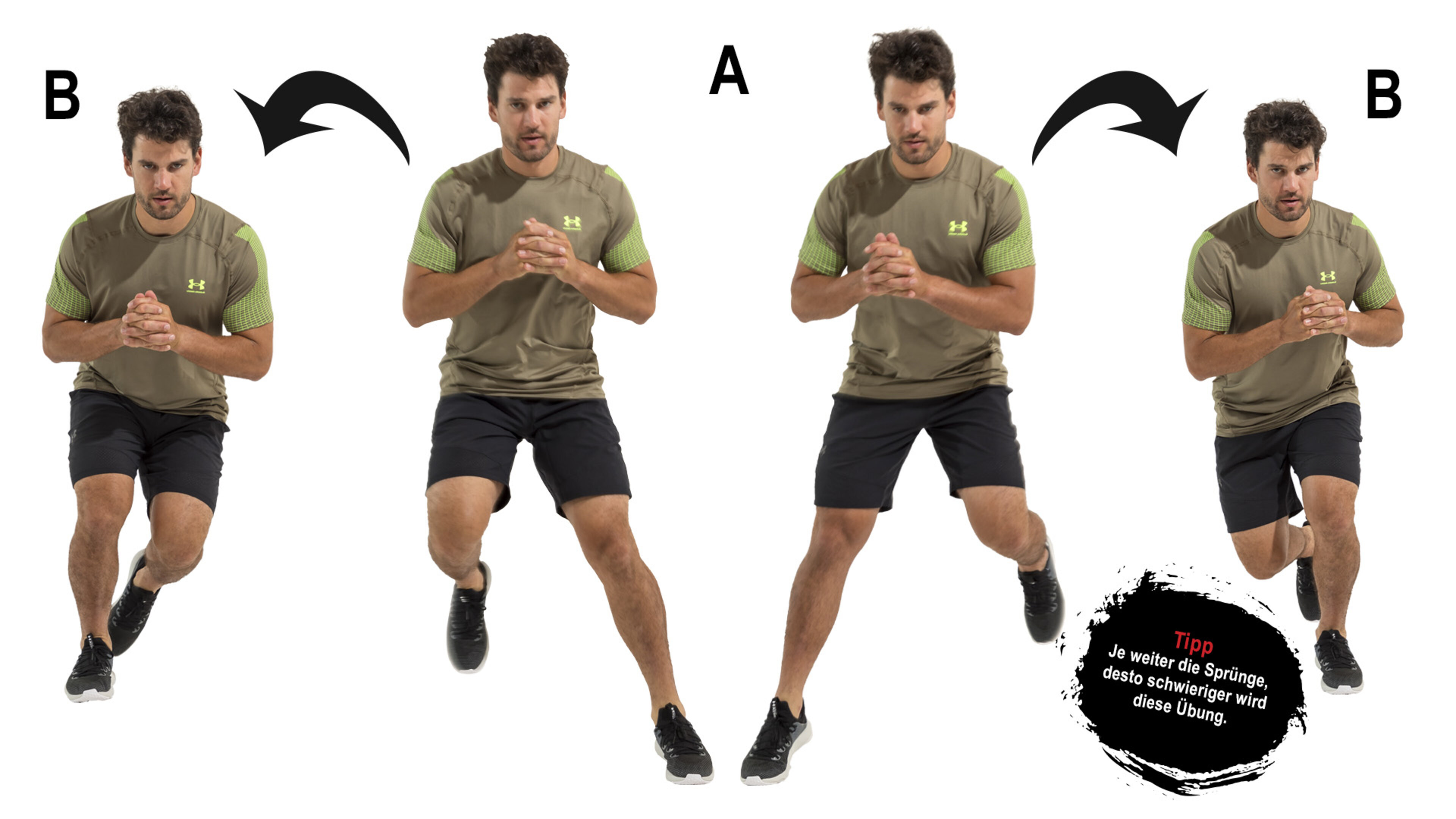 C. Springen Sie nun aus dieser Position senkrecht nach oben und wechseln Sie dabei das Bein, sodass Ihr hinterer Fuß nun vorne steht. Wiederholen Sie diese Bewegung ca. 8-mal pro Bein.