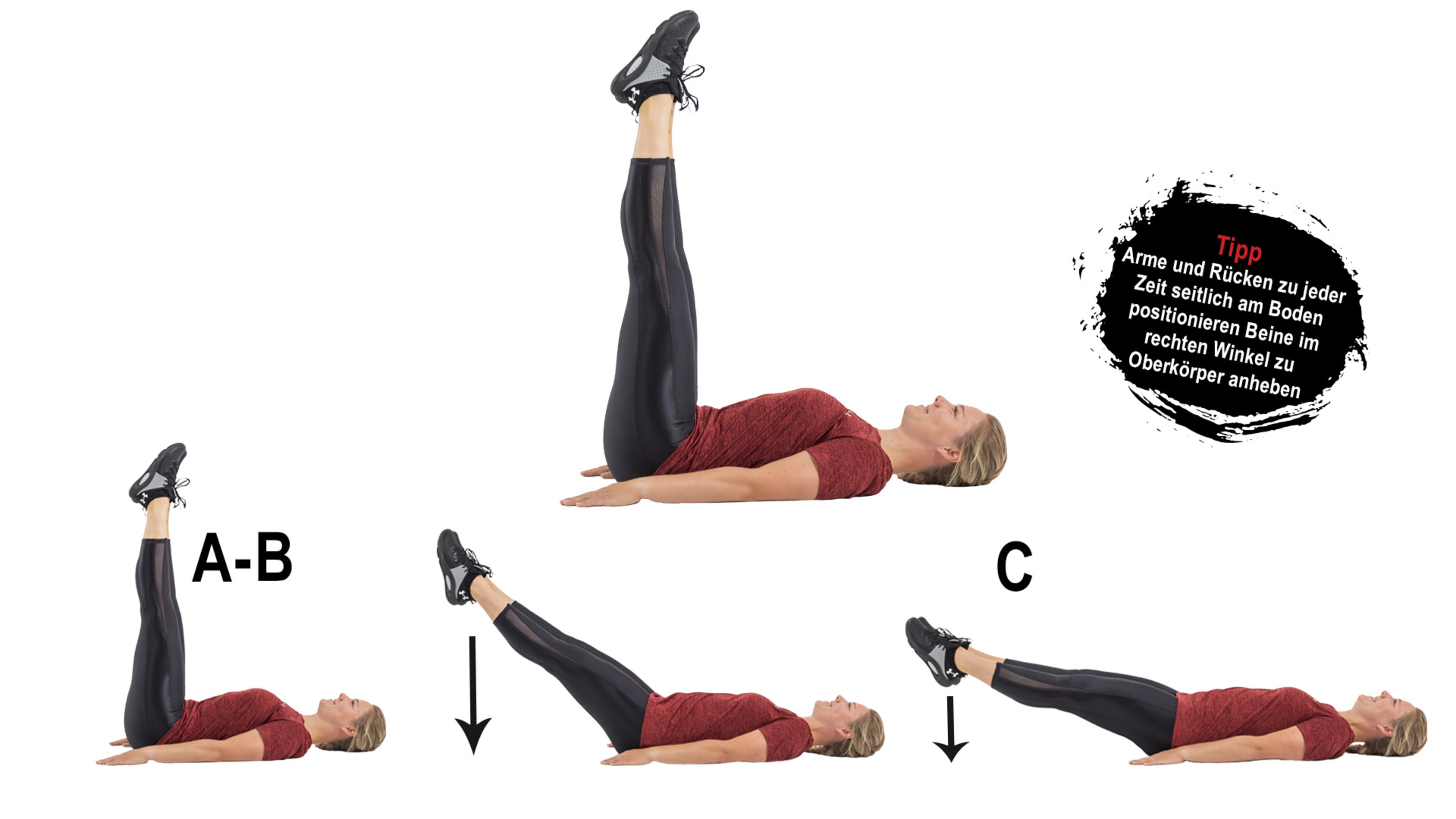 B. Heben Sie nun Ihre gestreckten Beine nach oben. Achten Sie darauf, dass Ihr Rücken zu jeder Zeit den Boden berührt.