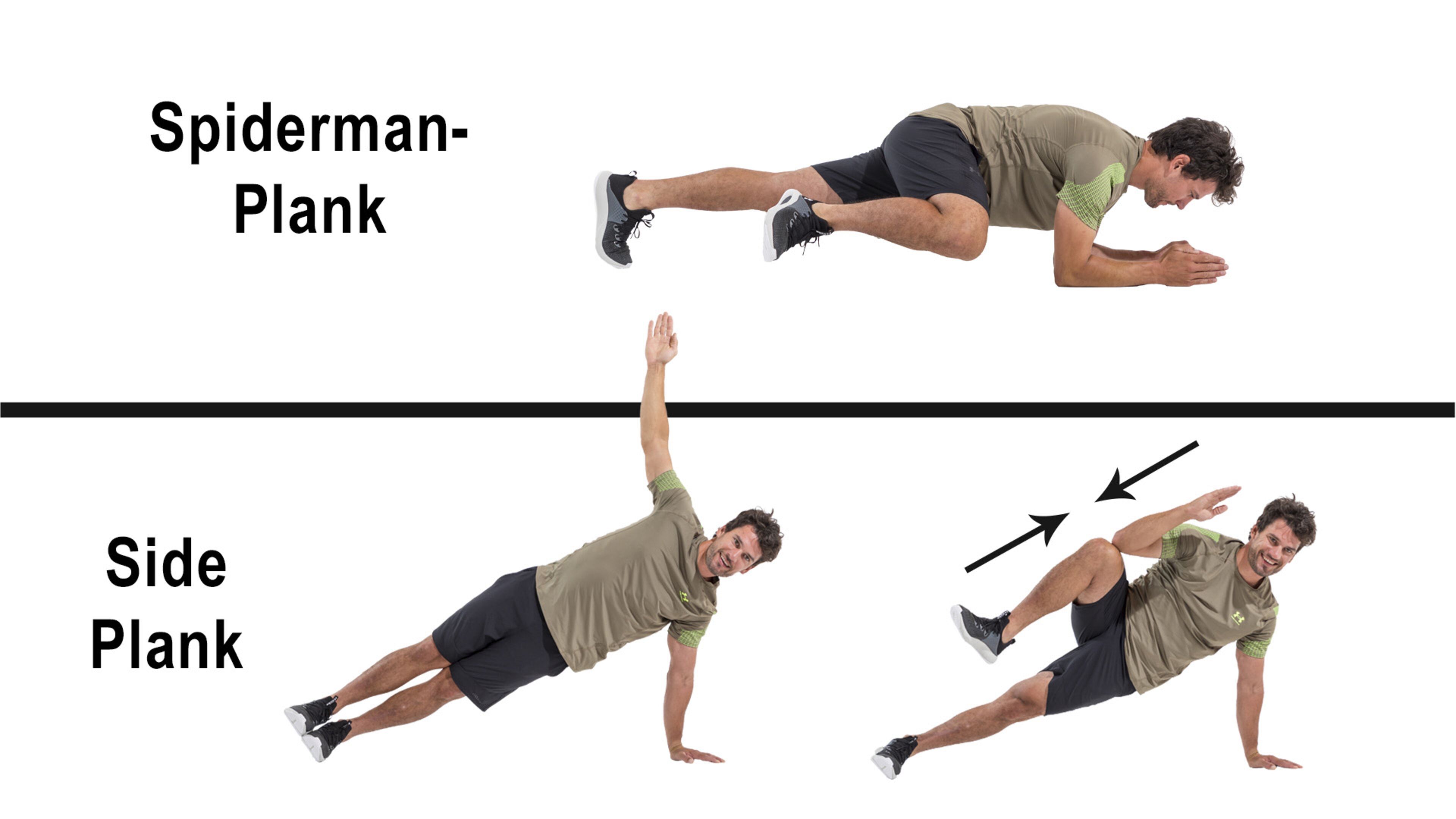 Side-, High- Low- und Spiderman-Plank