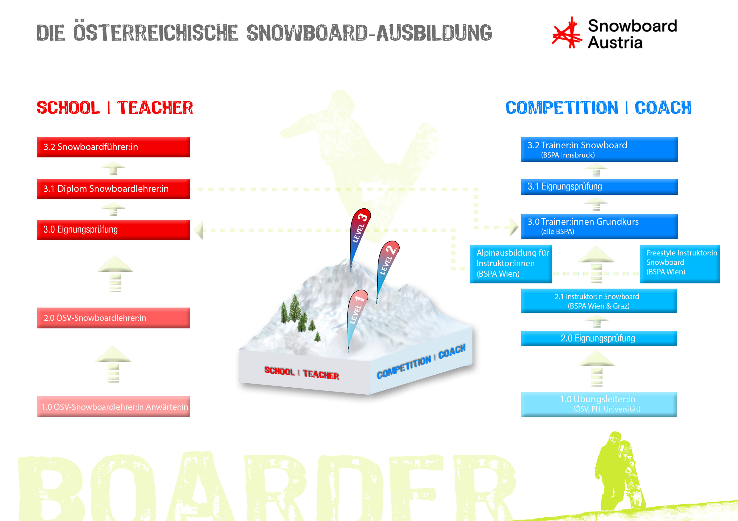 STUFE 2 Die Ausbildung Instruktor:in Snowboard wird an den Bundessportakademien Wien und Graz angeboten. Eine Besonderheit ist, dass du keine Ausbildungsgebühren zu tragen hast, die Kurskosten beziehen sich auf Unterkunft und Liftkarte. Diese Ausbildung befähigt dich zum Unterricht & Coaching im Verein.