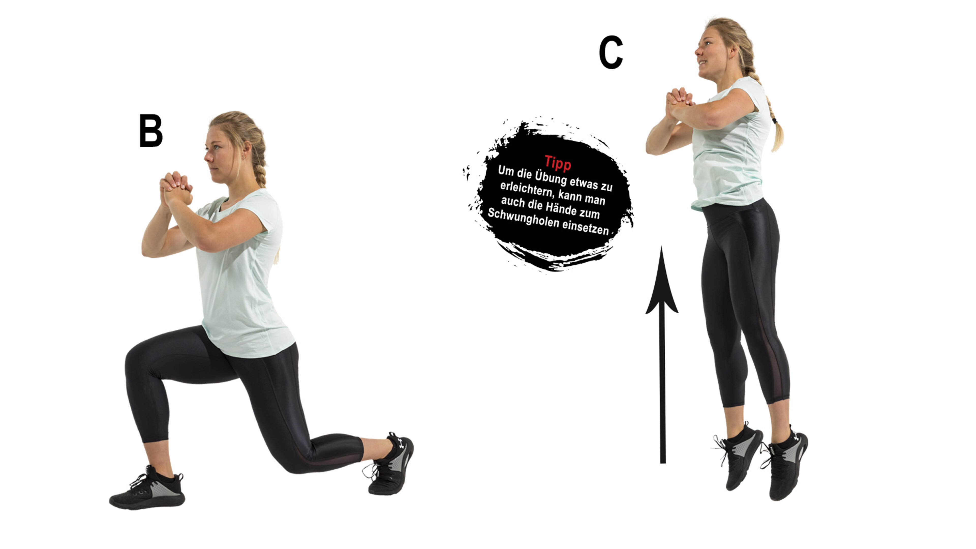 C. Springen Sie nun aus dieser Position senkrecht nach oben und wechseln Sie dabei das Bein, sodass Ihr hinterer Fuß nun vorne steht. Wiederholen Sie diese Bewegung ca. 8-mal pro Bein.
