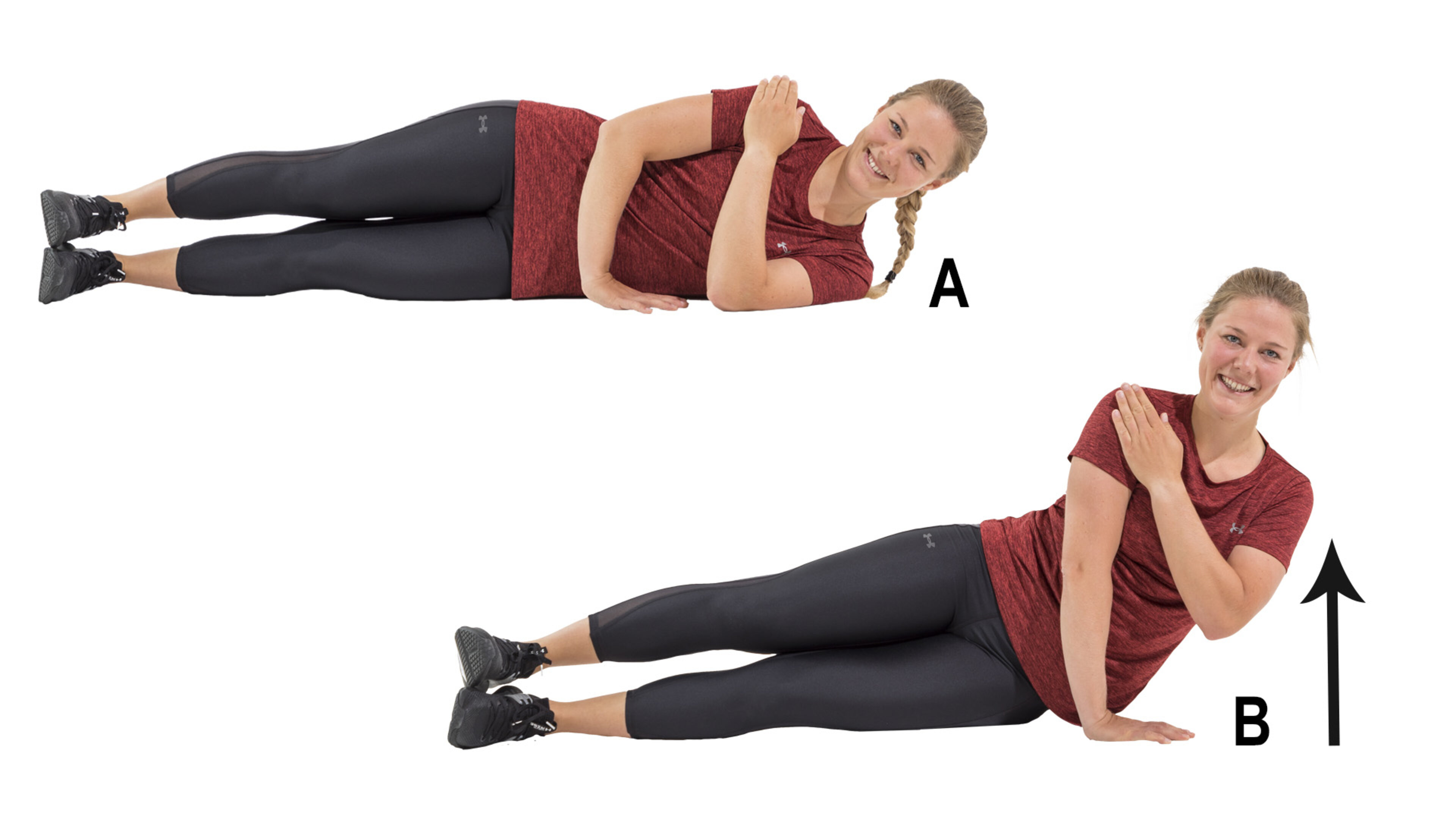 A. Nehmen Sie eine seitliche Position ein und stützen Sie sich mit Ihrem Arm vom Boden ab. Ihr Arm sollte direkt unter Ihrer Schulter platziert sein und Ihre Beine übereinander liegen.